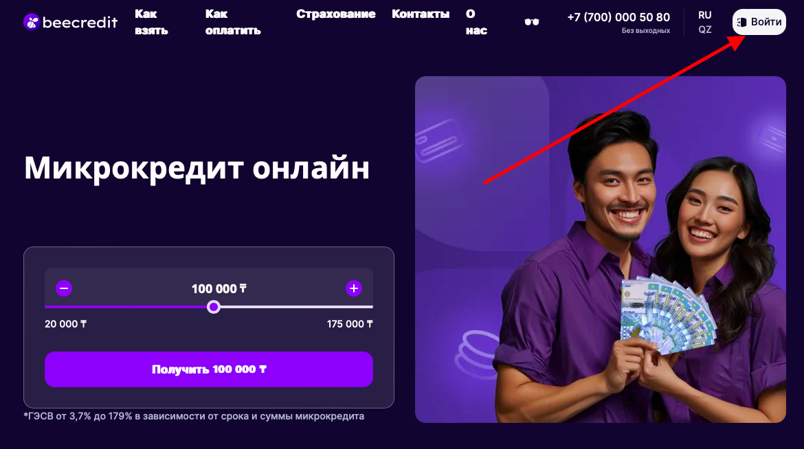 Для регистрации и создания личного кабинета нажмите кнопку «Войти», расположенную в правом верхнем углу главной страницы официального сайта BeeCredit.