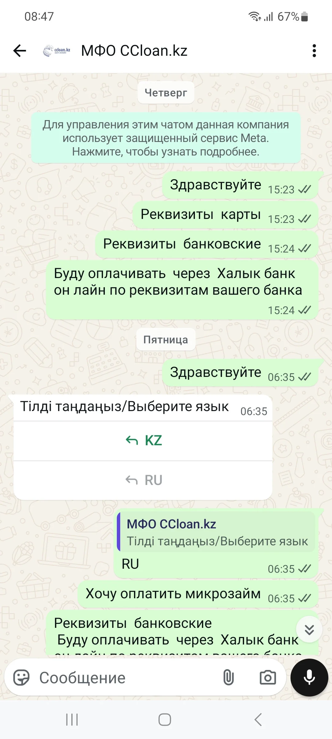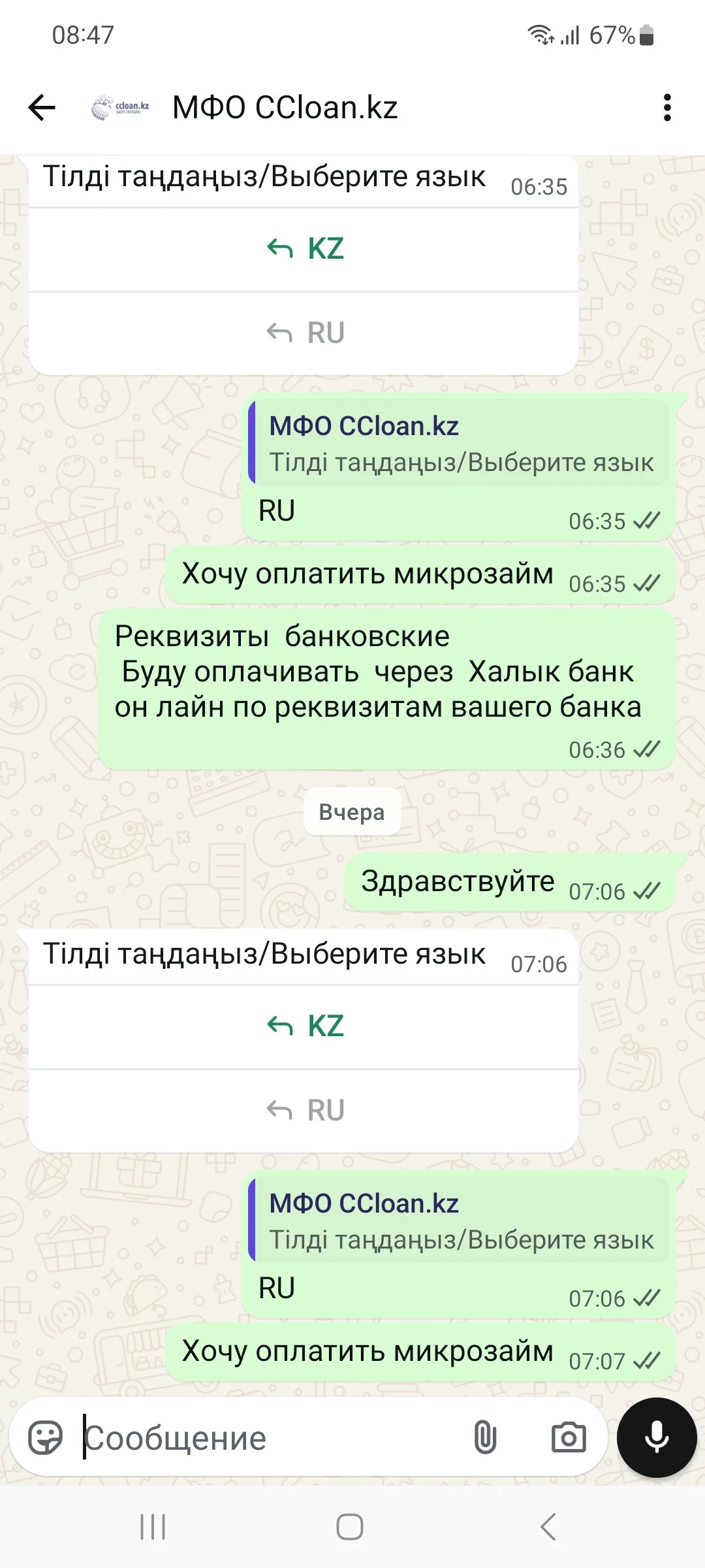 Жағдайды нақтылау үшін CCloan мекемесіне тікелей хабарласуыңыз қажет. Байланыс мәліметтерін мына жерден таба аласыз: https://bank.kz/mfo/ccloan-kz/contacts/