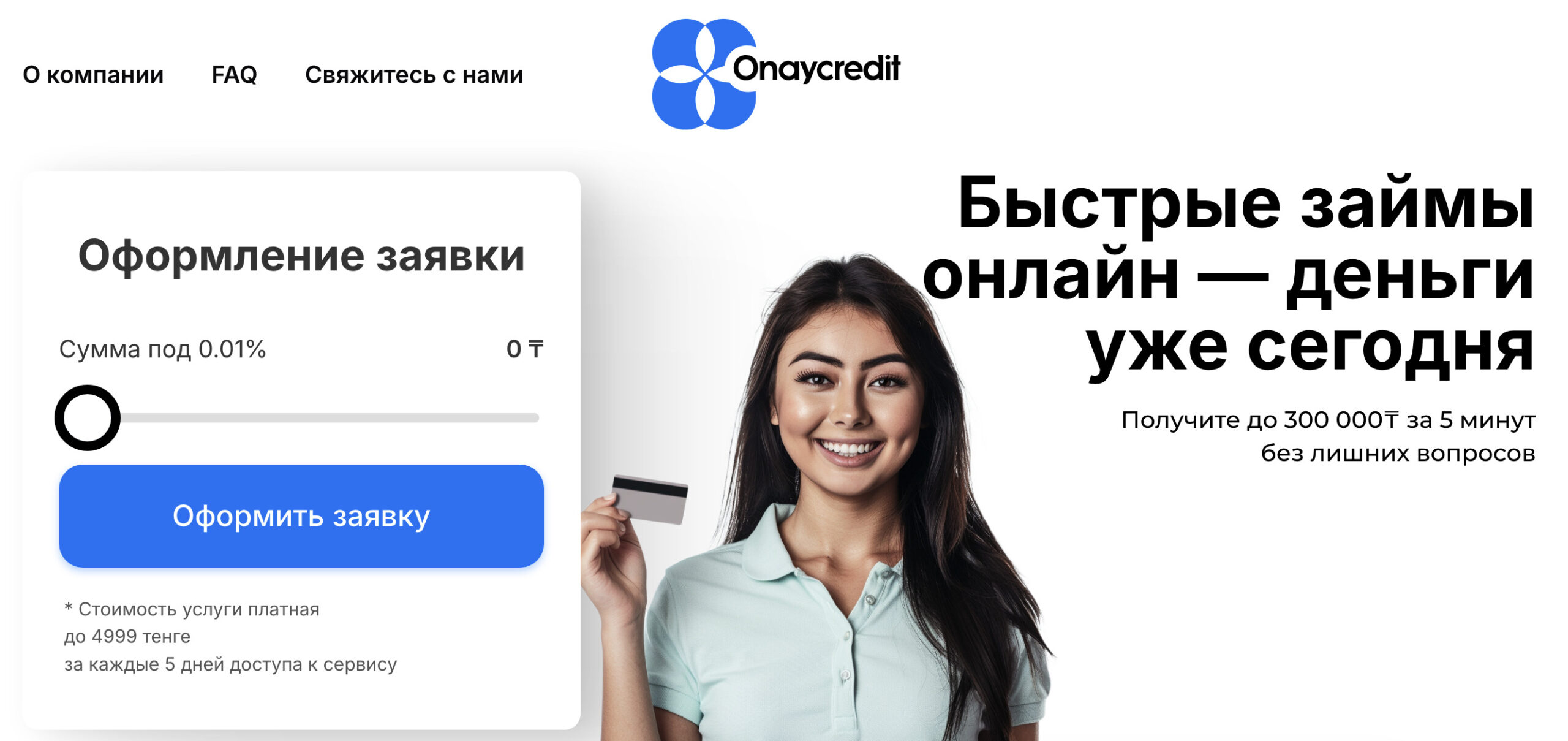 Onaycredit — платный онлайн-сервис для подбора микрокредитов в Казахстане. Пользователи могут быстро оформить займ на сумму от 5 000 до 300 000 тенге сроком от 7 до 30 дней. За каждые пять дней пользования сервисом взимается плата в размере 4 999 тенге. Заявки оформляются без лишних документов, а деньги переводятся на карту или банковский счет сразу после одобрения. Сервис рассчитан на простоту и удобство для клиентов.