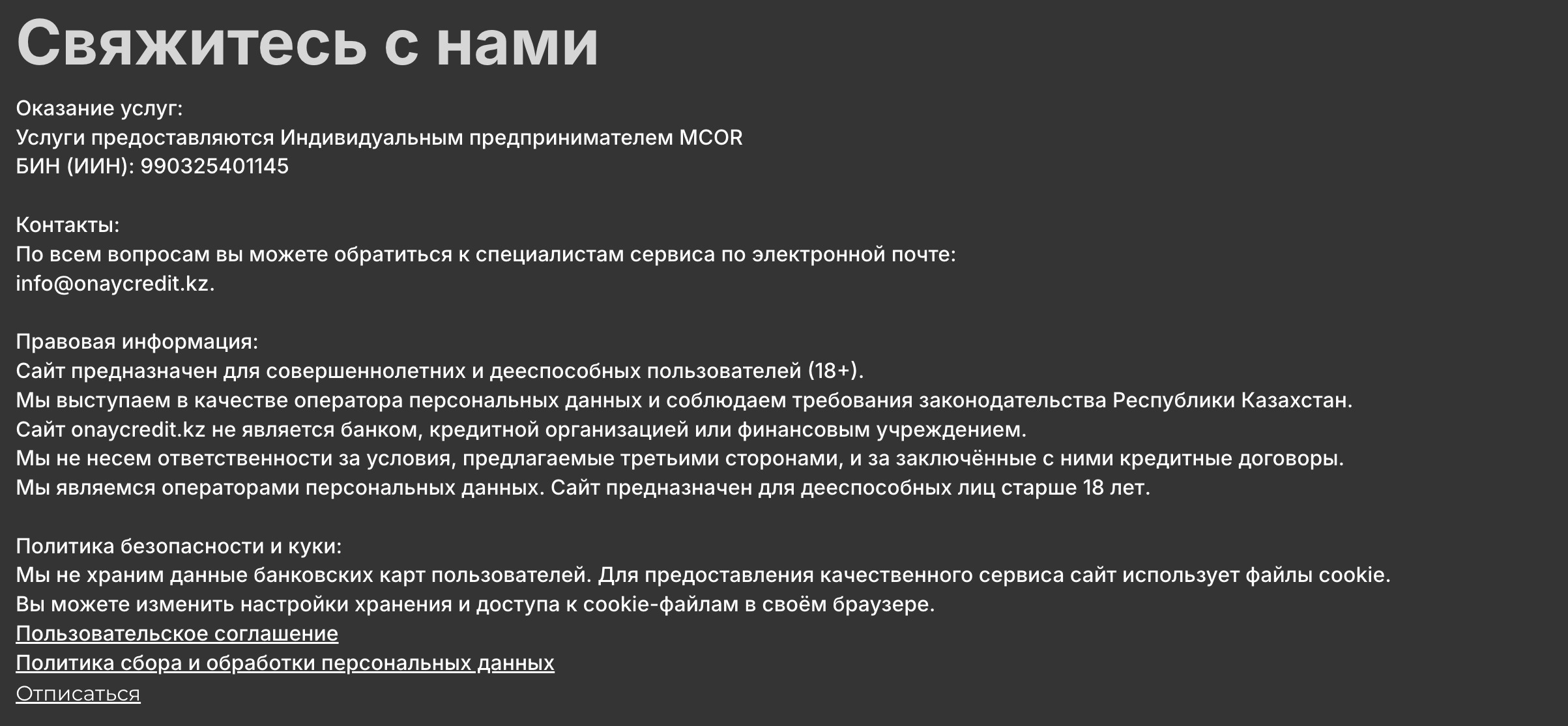 Пользователи Onaycredit могут в любой момент отказаться от платных услуг. Для этого нужно перейти на главную страницу, пролистать до конца и нажать «Отписаться».