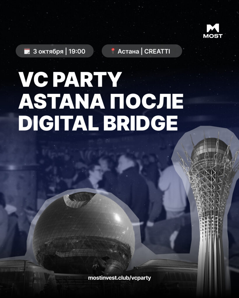 VC Party пройдет 3 октября в CREATTI по проспекту Мангилик Ел, 59, Астана, начало в 19:00. Билеты доступны на сайте https://mostinvest.club/vcparty.